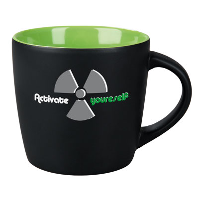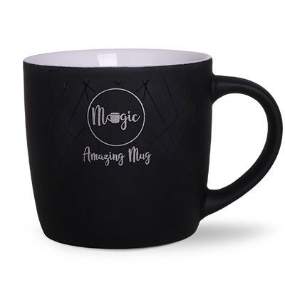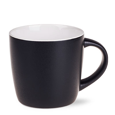 Bardzo popularny kubek reklamowy o klasycznym, obłym kształcie oraz nowoczesnym, matowym szkliwieniu. Błyszczące, kolorowe wnętrze doskonale kontrastuje z czarną satynową powierzchnią na zewnątrz. Kubek dostępny w bardzo wielu wersjach kolorystycznych.