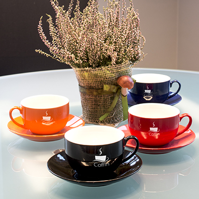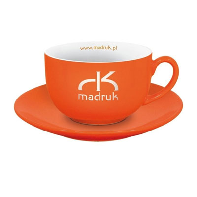 Obła filiżanka reklamowa z kolorowym szkliwem na zewnątrz i białym wnętrzem. Fason dostępny w wielu wersjach kolorystycznych.
